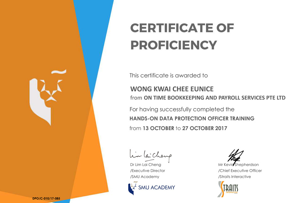 Ms Eunice is the certified Data Protection Officer (DPO) of On Time. As such, all practices carried out at On Time Bookkeeping And Payroll Services Pte Ltd are subjected to Personal Data Protection Act (PDPA), an Act that regulates the collection, use and disclosure of personal data among organisations. PDPA is essential to maintain individuals’ trust in organisations that manage data.